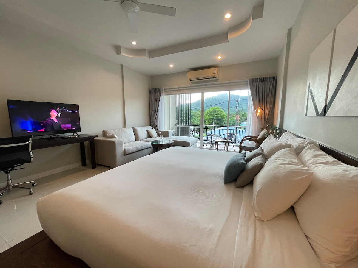This stylish Pool View One Bedroom suite is located in Naiharn-Rawai Area. Suitable for small family , Couple , group friends. Total area 55 Sq.m. Feature living area , Kitchen , Bathroom , Bedroom and Balcony. All attraction place within 3 km is Naiharn Beach , Rawai Beach , Phromtape Cape , Kata View Point , Sinbi Muaythai Gym and many others.
