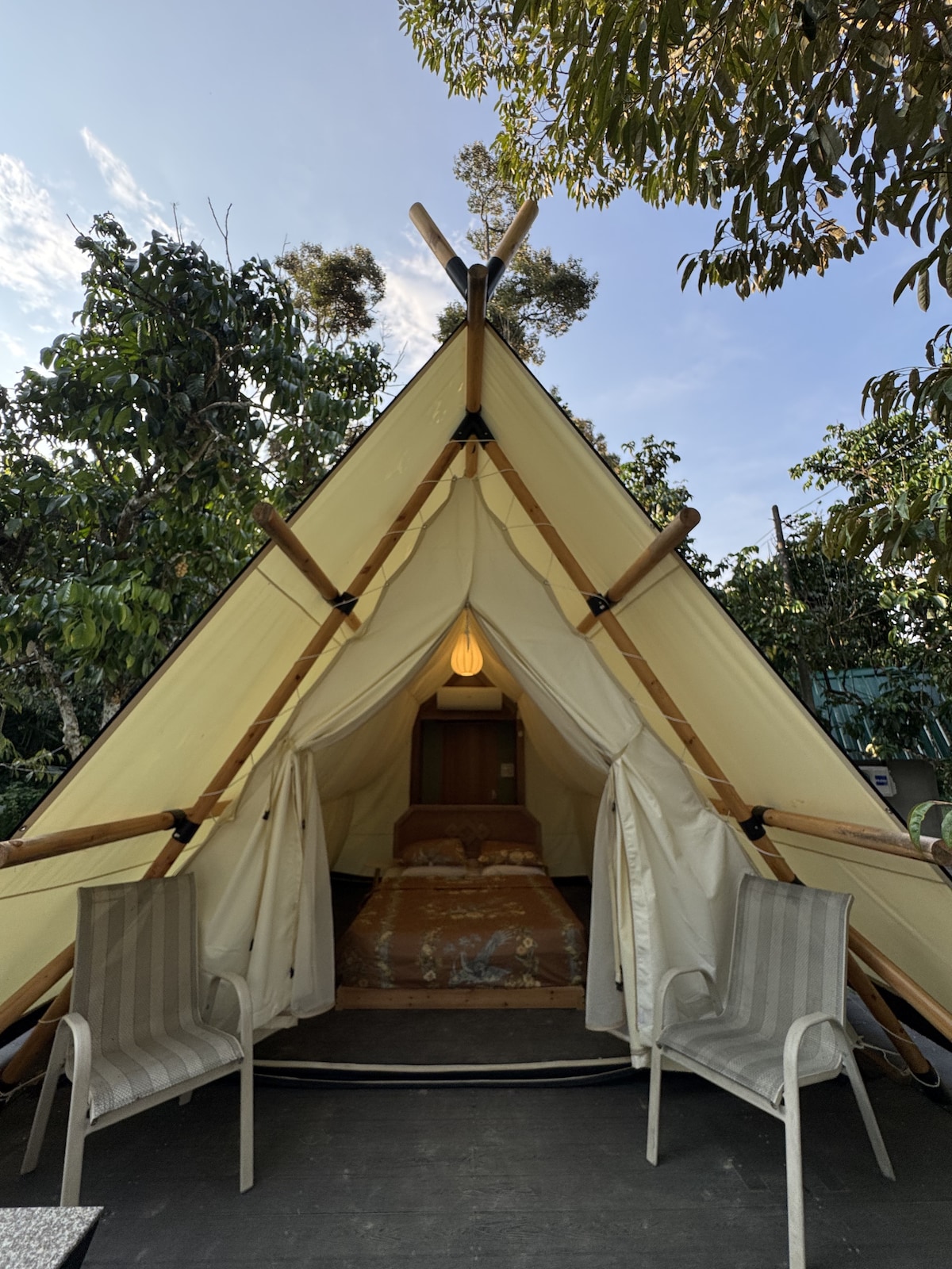 Three-Bedroom Glamping with View房型专为家人和朋友结伴出行而设计,空间宽敞,住起来舒适又放松。 房型包含: 1: 3 间独立卧室(2 间 1.8米的大床房 + 1 间两张1.2米的双人房),总共四个床位 2:室外设有独立用餐区 3:户外洗衣机 4:每间卧室设有独立空调 5:一间室内独立浴室+室外淋浴和厕所 6:公共泳池 无论是家庭出游、朋友聚会,还是多人度假,都能轻松入住。 而且酒店也设有公共泳池房型和私人泳池房型,酒店也有公共泳池区域,入住后酒店会提供可到达公共泳池区域的门禁卡。 Three-Bedroom Glamping with View房型非常适合希望住在一起、共享美好假期回忆的家人和朋友。并且可以在自然环境中,结合露营氛围与舒适住宿体验,享受安静、悠闲的度假时光 该房型共有 4 个独立帐篷房,房间设计与大小一致,确保每位客人都能享有同等的舒适感与体验。 请注意,酒店将在确认预订后根据空房情况安排具体入住房间。