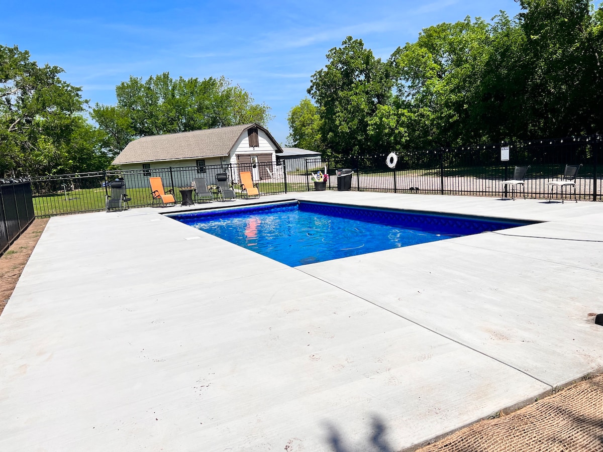 Medicine Park’s only handicap accessible, shared pool, private patio & real hot tub, 800 sq ft, 2 bedroom, kitchen, washer/dryer, 65’’ TV (Netflix, YoutubeTV), playground on secluded 9-acres No steps, wheelchair shower, accessible doors King lift bed, 2 twins, & blow-up queen, Sofa, Sleeps 7 5 minutes to Apache gate Ft Sill, Medicine Pk, Wichita Mountains National Wildlife Refuge. Heated shared Pool fm Apr 1-Oct 31. Pets ok w a fee, Add guests for fee Exterior cameras on entrance & side