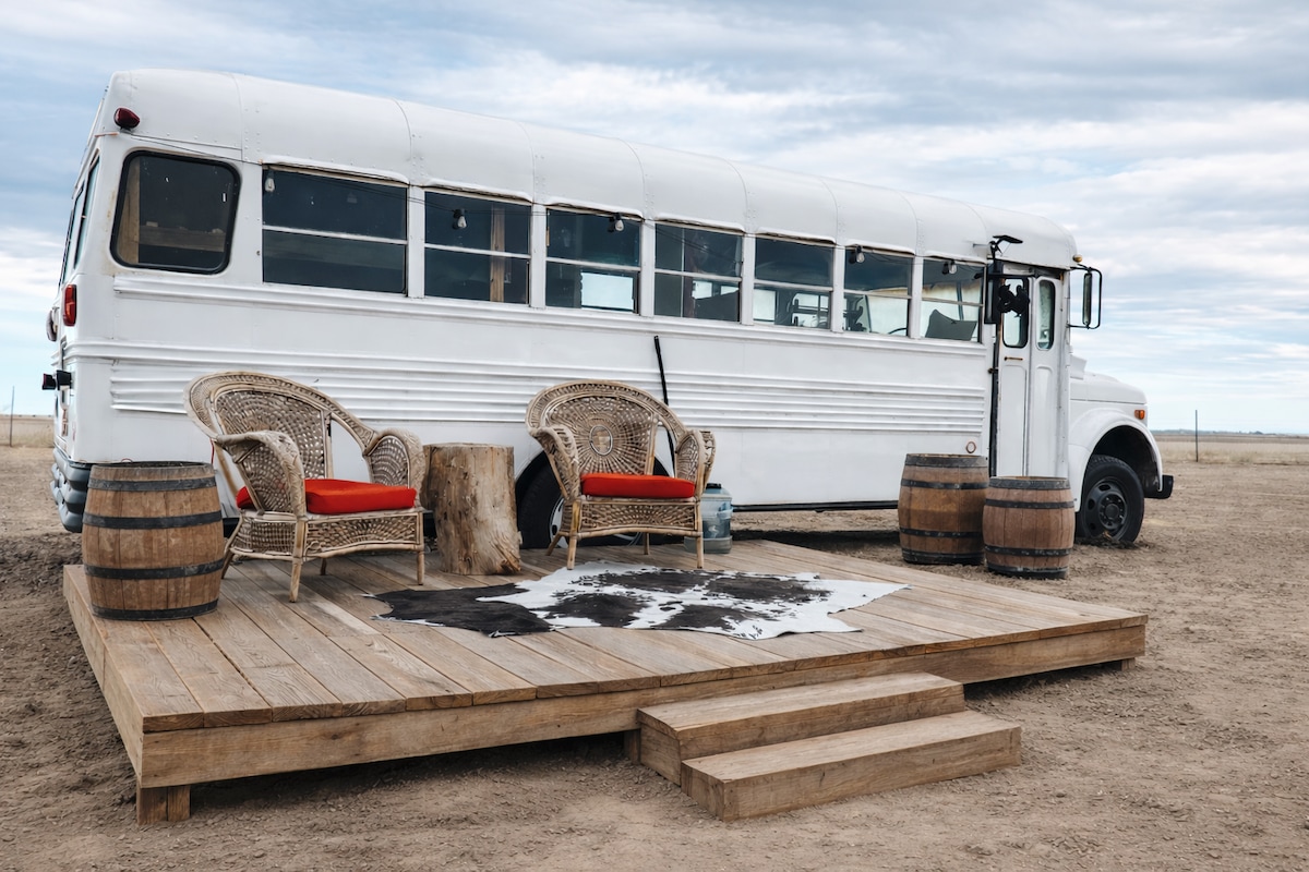 Escape to our charming bus, tucked away on a peaceful property near I-27 & FM 1585. Only 2 mi. from Cook’s Garage, 10 mi. from Texas Tech, & 15 mi. from the airport, this unique glamping space offers a Queen bed, kitchenette, living area, and private bath. Enjoy gourmet coffee as you take in stunning sunrises and sunsets. Note: Guests 6’ or taller may not be able to stand upright in the bus. There may be other guests staying in other domiciles on the premises. Book now for an unforgettable stay!