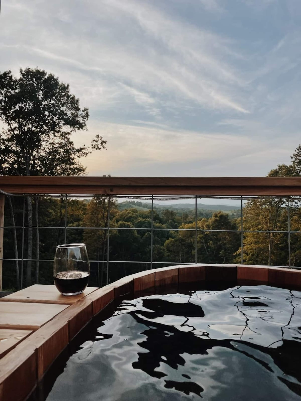 带雪松热水浴缸的狐狸木穹顶,可欣赏山景