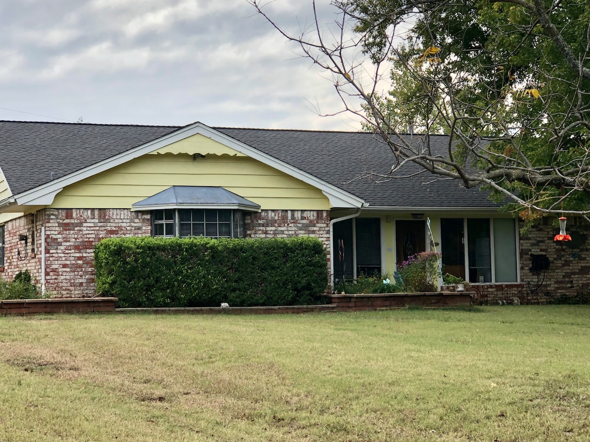 Low single occupancy rate, $10/guest thereafter. Tucked away on 5 serene acres in central Edmond, Hidden Hollow Honey Farm offers 540sq ft of safe, quiet lodging w/in walking distance of Edmond restaurants & activities. Close to Mitch Park/Golf/Route 66/OCU & UCO/Soccer/Tennis. 2nd bedroom is a small bunkhouse for kids - see pics. WIFI, 2 big Smart TV’s w/antennas, King bed, toys/books/games, rustic cottage kitchen w/coffees/teas/snacks, patios w/firepits/swings, pond/apiary views, & wildlife.