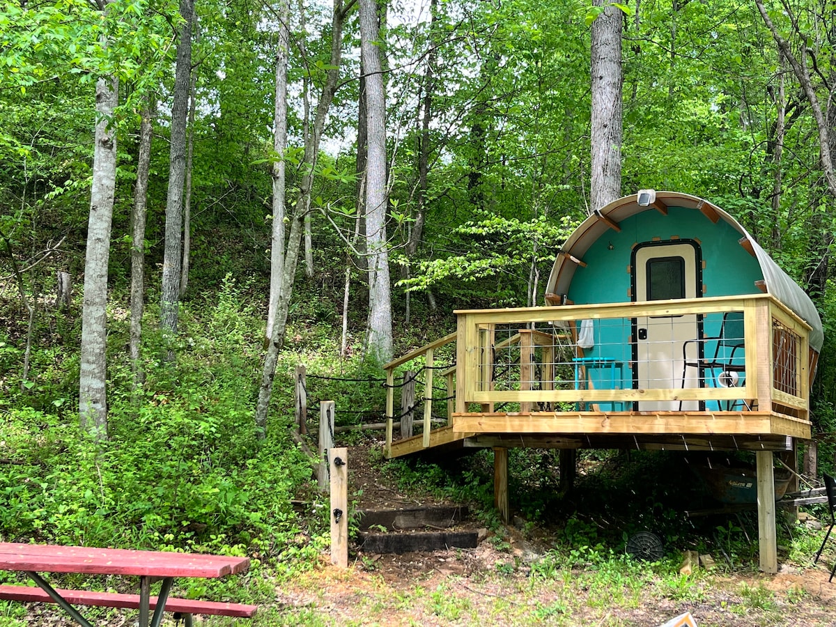 Reconnect with nature at this unforgettable escape. Treat yourself to an amazing getaway in this lovely little covered wagon venue, located directly along the banks of the Cumberland River. Electric only, detached restrooms. Enjoy River view, take in the sounds of nature, birds, the flowing water. Wake up to an amazing sunrise. This cute wagon set up has a queen bed, table, bench seats, coffee pot, picnic table, fire ring, grill and a lovely deck to relax and watch the river flow by. Read on…
