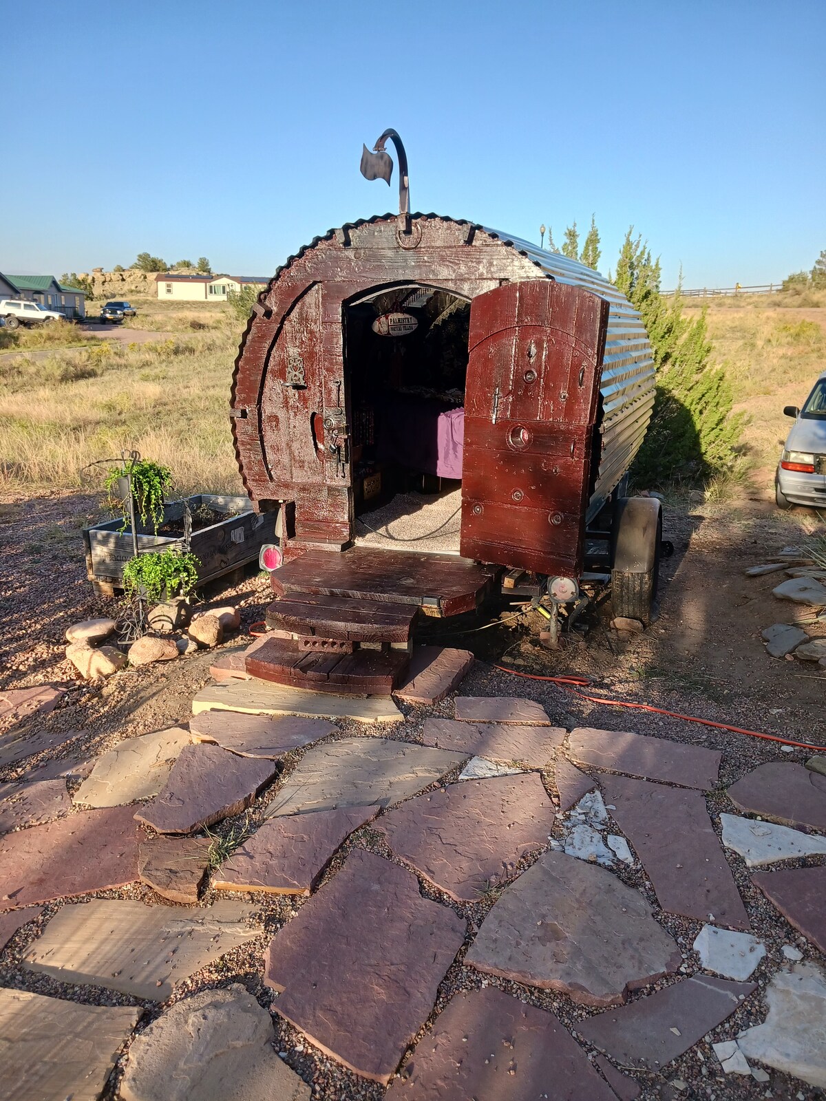 Luxurious Covered Wagon, designed to sleep 2, featuring a King bed with luxury linens, bathroom and shower. Includes dining table, outdoor seating with fire pit, and all the every day essentials like kitchenette with a coffee station and mini fridge, heating and air, designated parking for two vehicles. No animals or pets allowed.