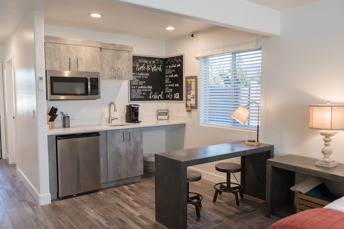 Relax and unwind in this cozy suite that has been newly remodeled paying attention to every detail necessary for your comfort and pleasure. Perfect couple getaway! Within walking distance of the world renowned Utah Shakespeare Festival, Utah Summer Games, vibrant and historic downtown, and a short drive to Cedar Breaks, Brian Head, Bryce Canyon, and Zion National Park. This location can't be beat!