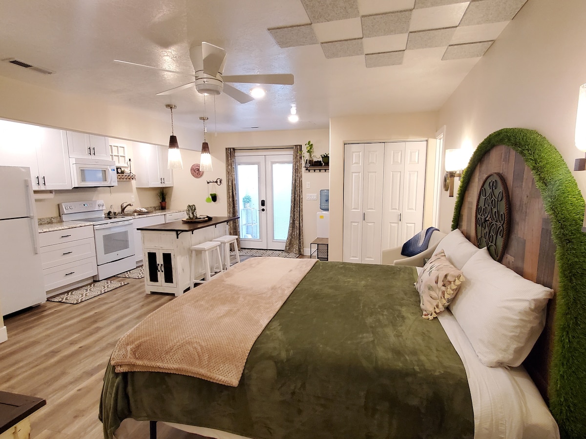This King suite is on the same property as the Hobbit Cottage. LOTR fans welcome! King size studio with laundry & full kitchen. No animals allowed bc allergies. No smoking or parties. Has a private entrance down a flight of outdoor stairs, has a small private yard with grass and trees. Located in between Zion National Park, Cedar Breaks, Brian Head, Kanarra Falls, Kolob. Home of Shakespeare Festival and Utah Summer Games. 1 mile to downtown. Do NOT dusturb guests in the Hobbit Cottage out back.