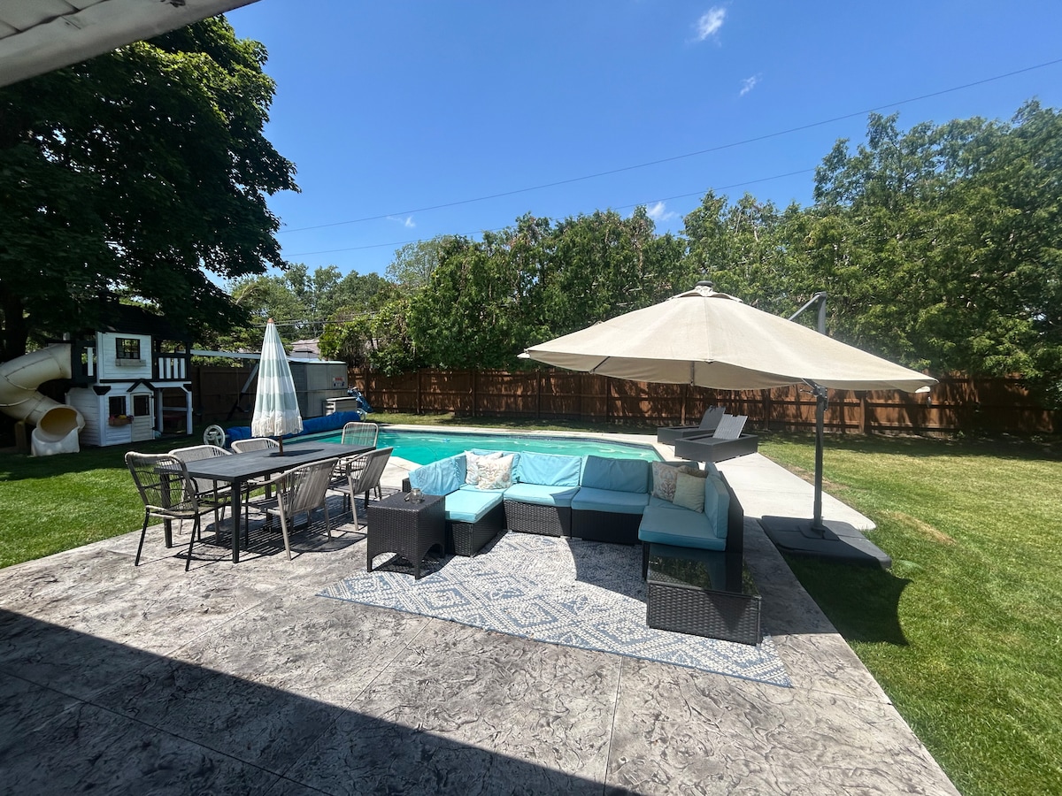 *HEATED POOL IS READY!* Welcome to Windsor’s largest and coziest stay! This gorgeous home blends modern design with comfort, featuring an inviting sunroom with soaring ceilings and natural light, perfect for morning coffee or quiet evenings. The chic decor creates a stylish, yet homey feel :) Unwind in a private backyard oasis with a 15x30, 8’ deep, in-ground oval pool with a brand NEW heater and BBQ lounge! Our backyard designed for a unique and relaxing family experience!