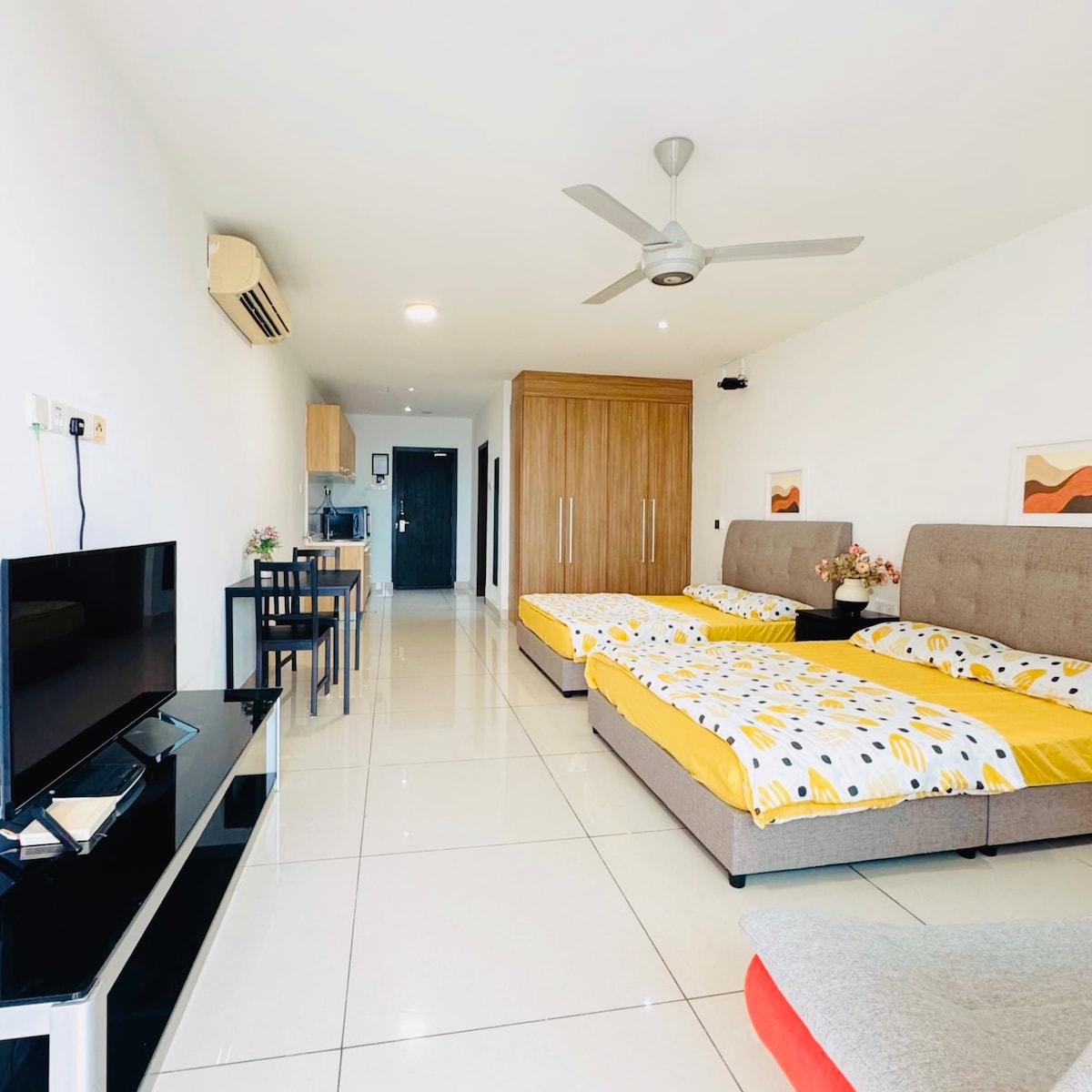 Fully furnished studio with 1 queen bed, 1 sofa bed and 1 matress. Possibility of simple cooking. More facilities than hotel room with lower price. Location just nearby shopping/dining paradise: AEON Tebrau, Capital21, Spring Labs, Mt Austin, Setia Indah, Johor Jaya. Taman Daya town with laundry service, McD, KFC, food court, ATM and banks within walking distance about 1km. WIFI, refrigerator, microwave, washing machine and more are provided.