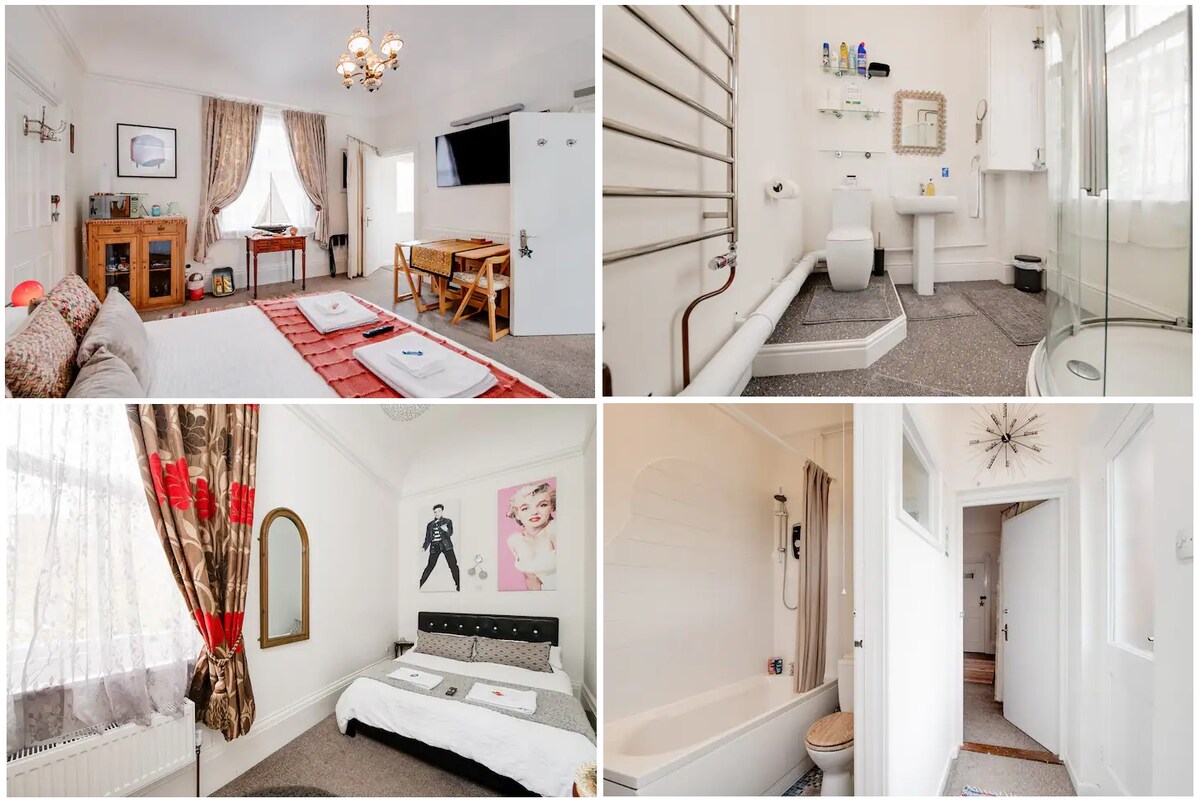 🎩The "Top Hat" apartment. Very clean, large self-contained, by the green expanse of Southsea Common & the seafront. A breath of fresh air! Take a quiet early morning stroll without the tourists. Although shops, bars & restaurants are only a stone's throw away, the area feels peaceful and secluded. Very private. Smart TV's with Xbox. Come & enjoy fabulous Southsea. Your adventure is ready & waiting. All it needs now is you! Host on site if needed. 🚘12hr/24hr street parking permits £5/£10 each.