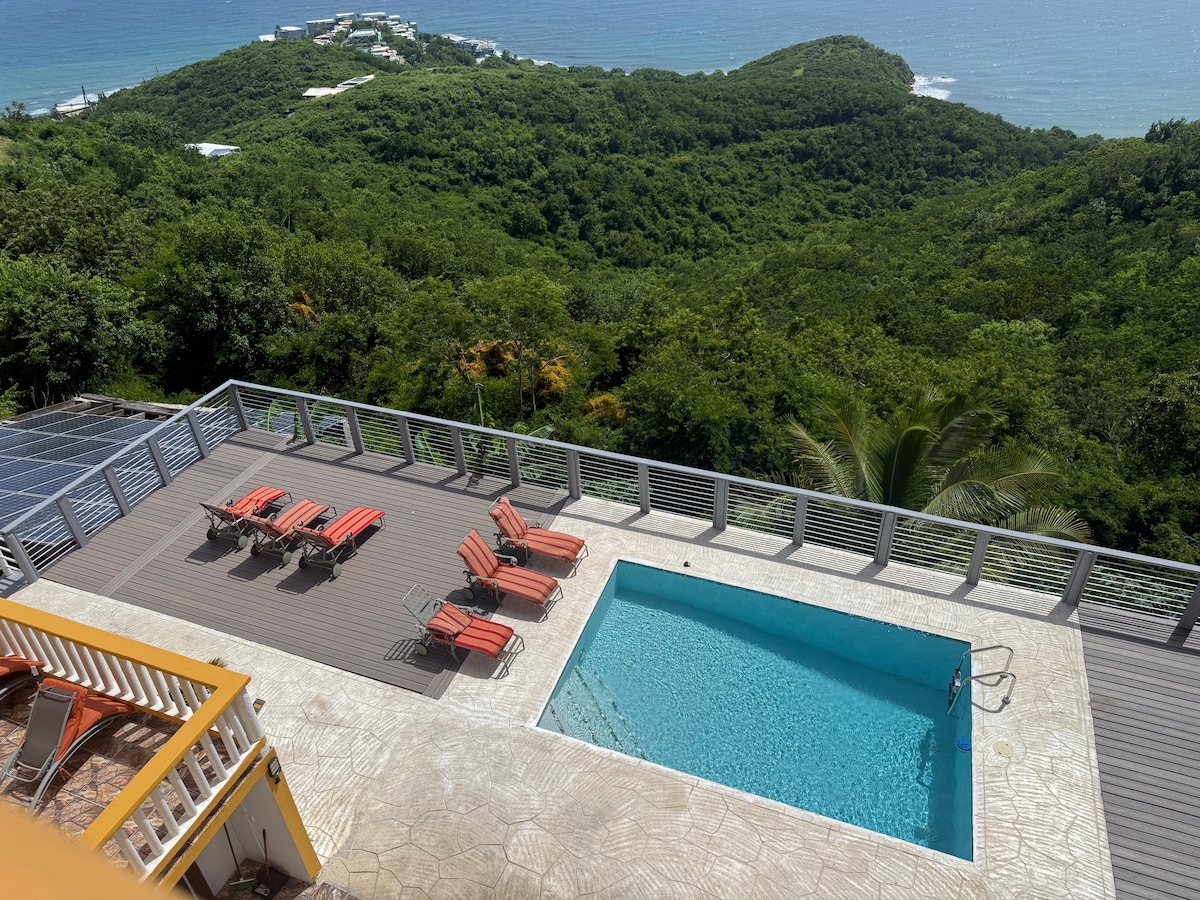 With spectacular ocean views, sunshine, balmy breezes (and AC) everywhere, this gorgeous 3-bedroom has views of the Caribbean and several islands throughout the windows from floor to ceiling across the whole front of the house. On a clear day, you can see St. Croix and the Spanish Virgin Islands of Vieques and Culebra! Watch sailboats and island ferries passing below over flamboyant and palm trees, parrots, geckos, iguanas, papayas, aloe, and oregano, and tamarind (in season).