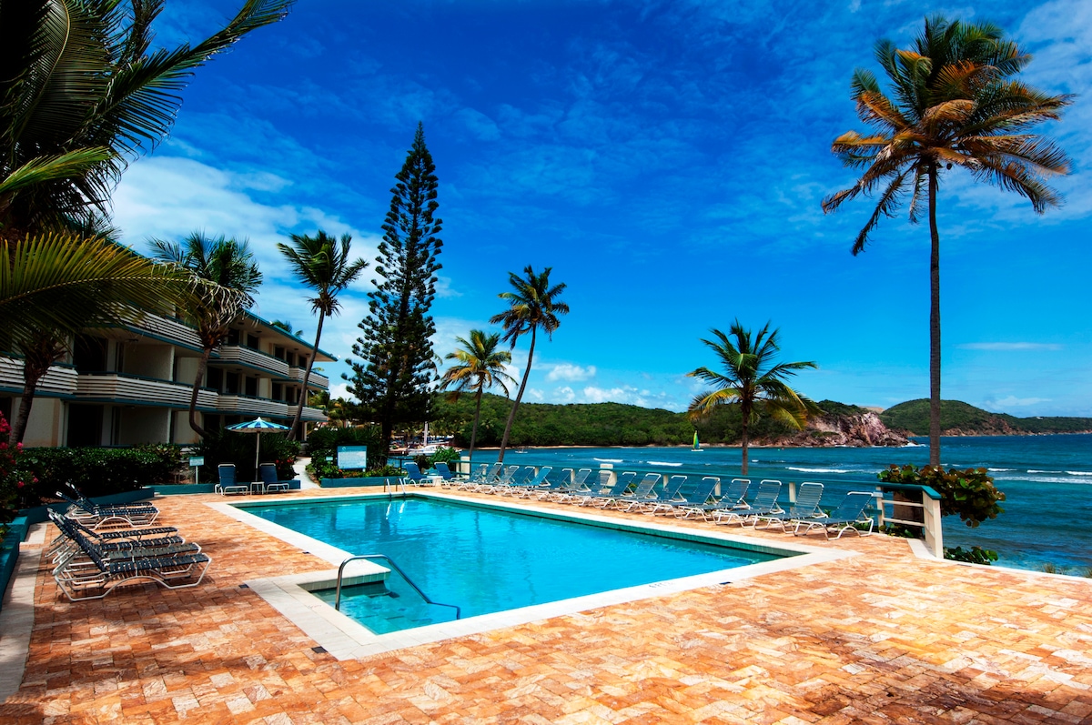 Our fully renovated 1BR/1BA condo is PERFECT for couples, small families or a friends getaway. Enjoy stunning ocean views and the sound of waves from every room or your private balcony. Watch breathtaking sunsets and cool off in one of three crystal-clear pools. Located in a gated community, just steps from the beach, oceanside pool, and seaside dining. Only 10 min to Red Hook (ferries to St. John & BVI) and Havensight, and 15 min from the airport—your perfect island escape! 🌴