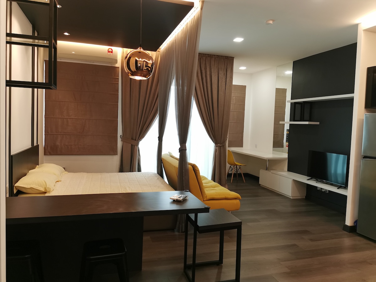 Explore our cozy studio, which can accommodate 2 to 3 people with a queen bed and a sofa bed. Only a 15-minute drive from KLIA T1/T2, the place is surrounded by many restaurants, fast food branches, groceries, and laundry shops, all within walking distance. Savor all the amenities, including the kids’ playground, BBQ area, gym, and swimming pool, with 24/7 security. * Unavailable drop your luggage before check in hours.Due to building designed, need to walk 10 steps staircase to get elevator.