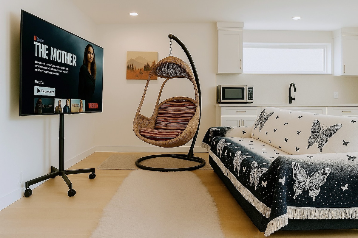 🏡 Key Features ✔️ Bright, spotless legal basement suite ✔️ 2 bedrooms with queen beds & hotel-style linens ✔️ Japanese-style futon (tatami floor mattress) for 5th guest ✔️ Kitchen with milk Keurig coffee maker ✔️ Cozy living room with 58" Smart TV ✔️Stylish indoor hanging chair ✔️ Private entrance & easy self check-in ✔️ Free street parking or driveway spot 📍 Nearby ✔️ 2-min drive to shopping center ✔️ 15-min drive to Rabbit Hill Ski Resort ✔️ 20-min drive to YEG ✔️ 20-min drive to WEM
