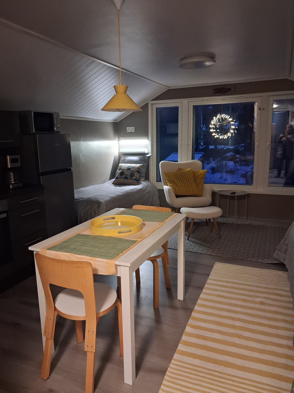 Yhdelle tai kahdelle monipuolinen, kodinomainen huoneisto Mynämäellä. Tarvittaessa myös kahdelle lapselle saadaan vuode sijattua vuodesohvasta. Huoneisto soveltuu hyvin pientä ylellisyyttä kaipaavalle, työmatkan rauhalliseksi etätyöpisteeksi. Aarno1 on sijainniltaan loistava kun matkustaa E8-tietä ja kaikki kylän palvelut ovat käytettävissä. Rauhallinen sijainti takaa hyvät yöunet. Aarno1 on varustettu ulkopore-ammeella, 55"TV:llä, nopealla 5G Wifi-liittymällä ja kaikilla kodin tarvikkeilla.