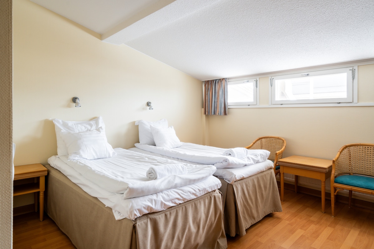 Winter offer free parking for hotel guests until end of March 2026. Homelike hotel room with great amenities at Hiisi Hotel Turku Seaport in Turku Harbour. The room featuring 2 single beds is suitable for up to 2 persons. Work desk and chair and an ensuite bathroom, a flat-screen tv and wifi. All rooms feature a mini fridge. Linen, towels and final cleaning are included. No breakfast, reception or air-conditioning. All rooms are located on the ground floor.