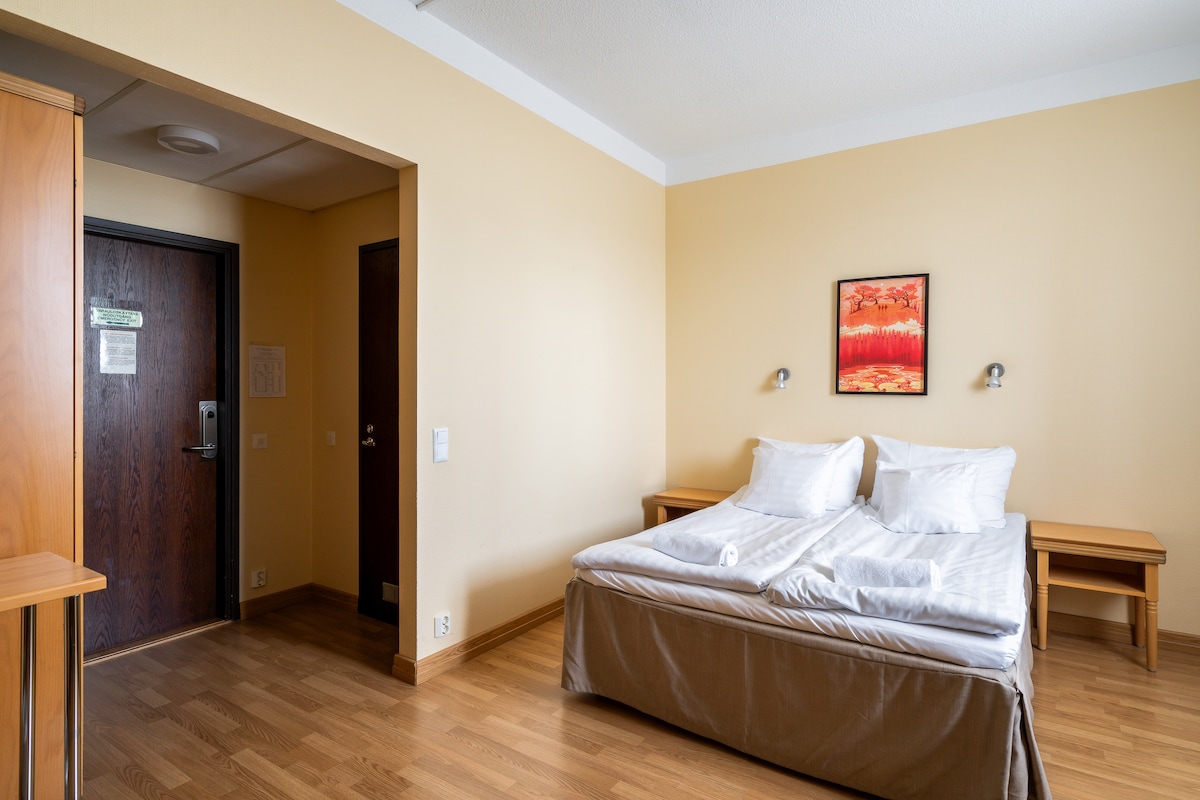 Winter offer free parking for hotel guests until end of March 2026. Homelike hotel room with great amenities at Hiisi Hotel Turku Seaport in Turku Harbour. The room featuring a double bed is suitable for up to 2 persons. Work desk and chair and an ensuite bathroom, a flat-screen tv and wifi. All rooms feature a mini fridge. Linen, towels and final cleaning are included. No breakfast, reception or air-conditioning. Please note rooms are both on 1st and 2nd floor and the hotel has no elevator.