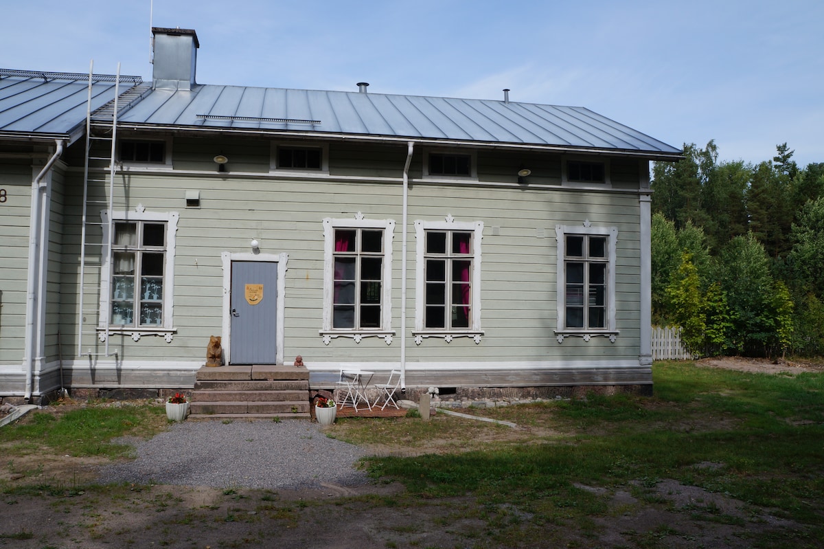 The house is the former Mustio railway station. The new renessaince building was completed in 1873. We offer atmospheric, exotic accommodation for 8 people in Raasepori Mustio, 70km from Helsinki. You get the second apartment in the house completely for yourself or for your group. You can explore the history of the station. The freight trains run rarely on the track. There are woods, walking trails and K-Market 100m away. Mustion Ruukki Beach is 3.2km away. Mustio's famous castle is 3.7km away.