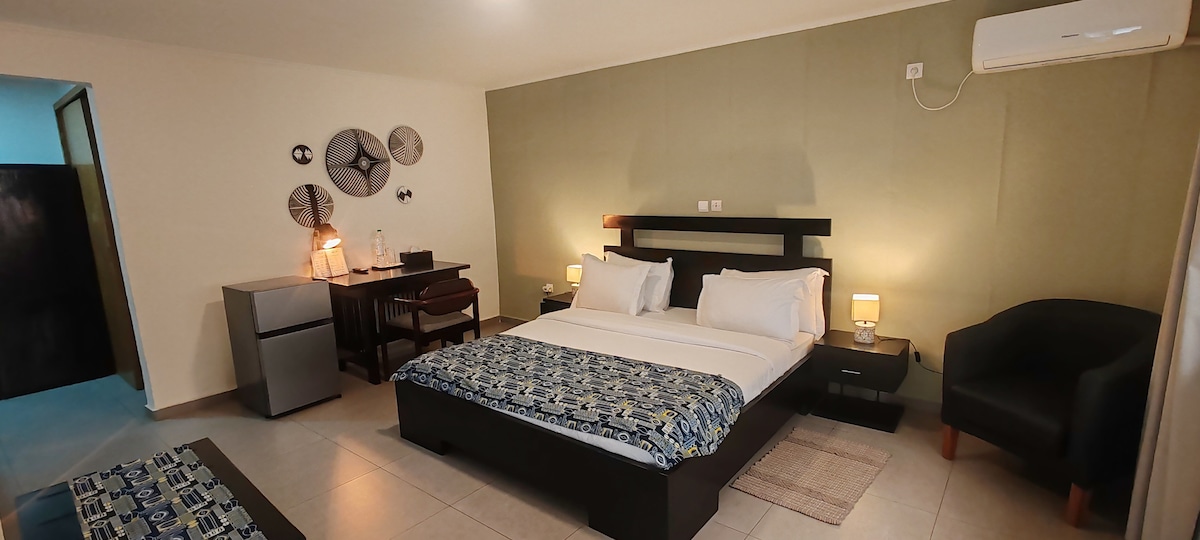 Ce logement est une suite qui consiste d’une chambre climatisé avec un très grand lit , Netflix sur smart TV , une salle à manger, un coffre-fort, une salle de bain avec jacuzzi et chauffe eau, une cuisine entièrement équipée avec des ustensiles de cuisine, un balcon , un wifi haut débit , un parking gratuit sécurisé 24h/24 7j/7 , des caméras vidéo surveillance, un groupe électrogène, un forage , des voitures en location, une terrasse avec billard et karaoke