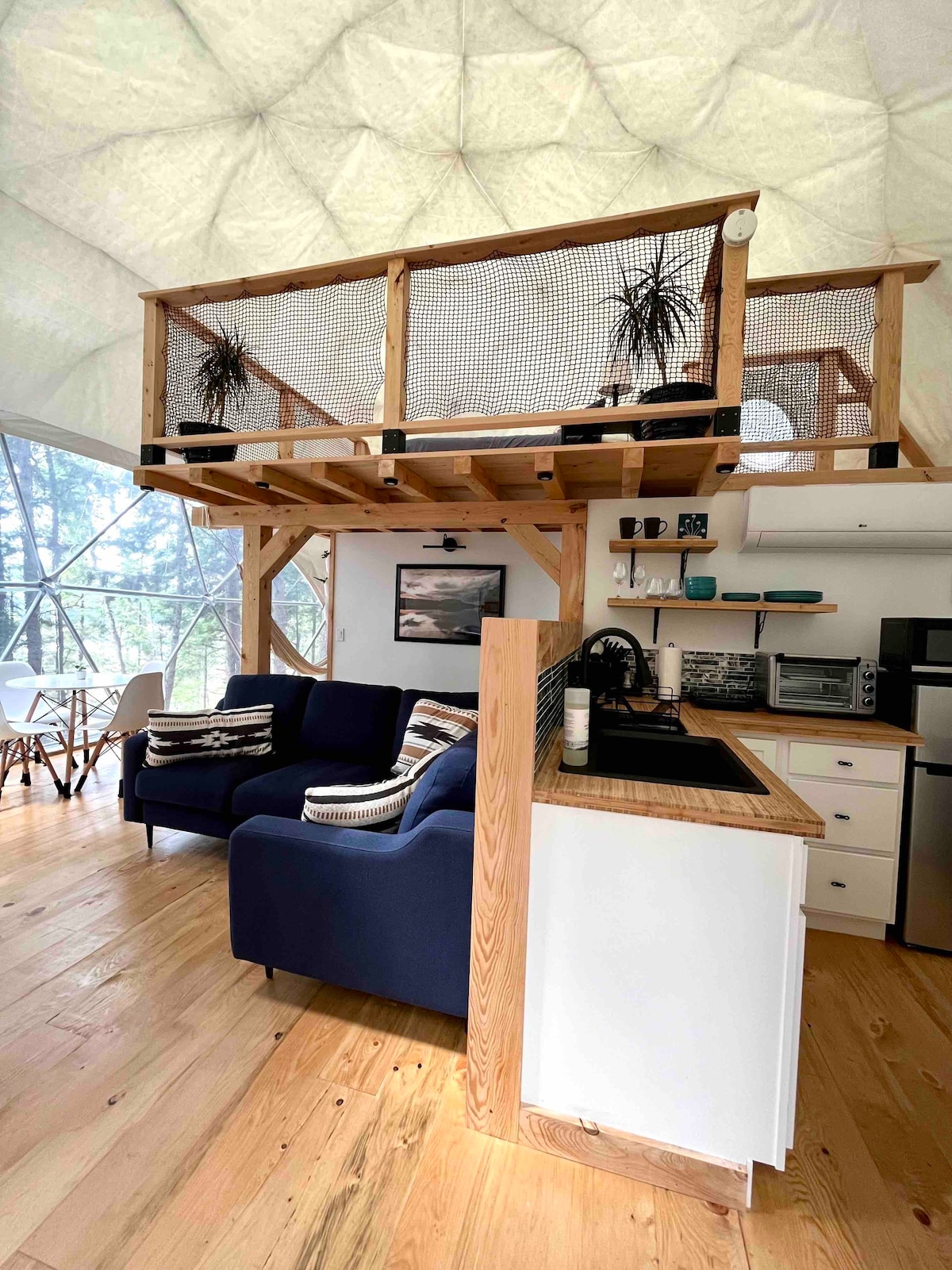 Escape into nature with a stay in one of our luxury domes. Fully equipped kitchen with cookware, dishes, utensils, etc, as well as coffee and tea. Private bathroom with a toilet, shower, and essential toiletries. Two queen size beds with a loft space. The outdoor area includes a BBQ, private electric hot tub, and patio furniture. Kayaks are available during the summer months, as well as a communal fire pit. **Please note, there is a short walk down a hill to get to the dome**