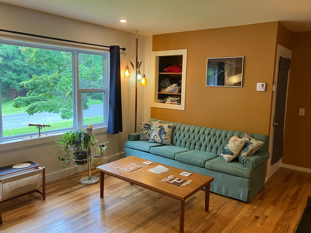 Complete upper main floor of a duplex home home with some water views from large living room windows and private deck. Located in the Saint Andrews town Plat, 1 block from the water and 1 km from downtown. Within a block to the beach, the park (for kites etc!), walking and biking trails. Wifi, parking. Hardwood floors. 2 bedroom, plus sofa bed. 1 full bath. Full kitchen and laundry. Enjoy the Mid Century Modern and vintage furniture appeal. Note: not toddler proof.