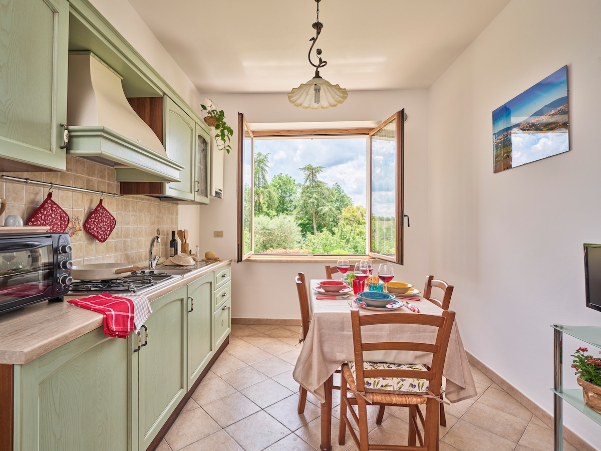 Apartment with beamed ceilings and terracotta floors, this apartment is set in a 19th-century farmhouse located in the hills of Siena in Rigomagno Toscana. From the solarium next to the swimming pool in the middle of the olive trees, you can admire the panorama of the Sienese hills and the medieval village of Rigomagno ... all this characterizes the ideal holiday for couples or families who want to relax. Solarium, garden, terrace, swimming pool are exclusively for guests of the apartment.