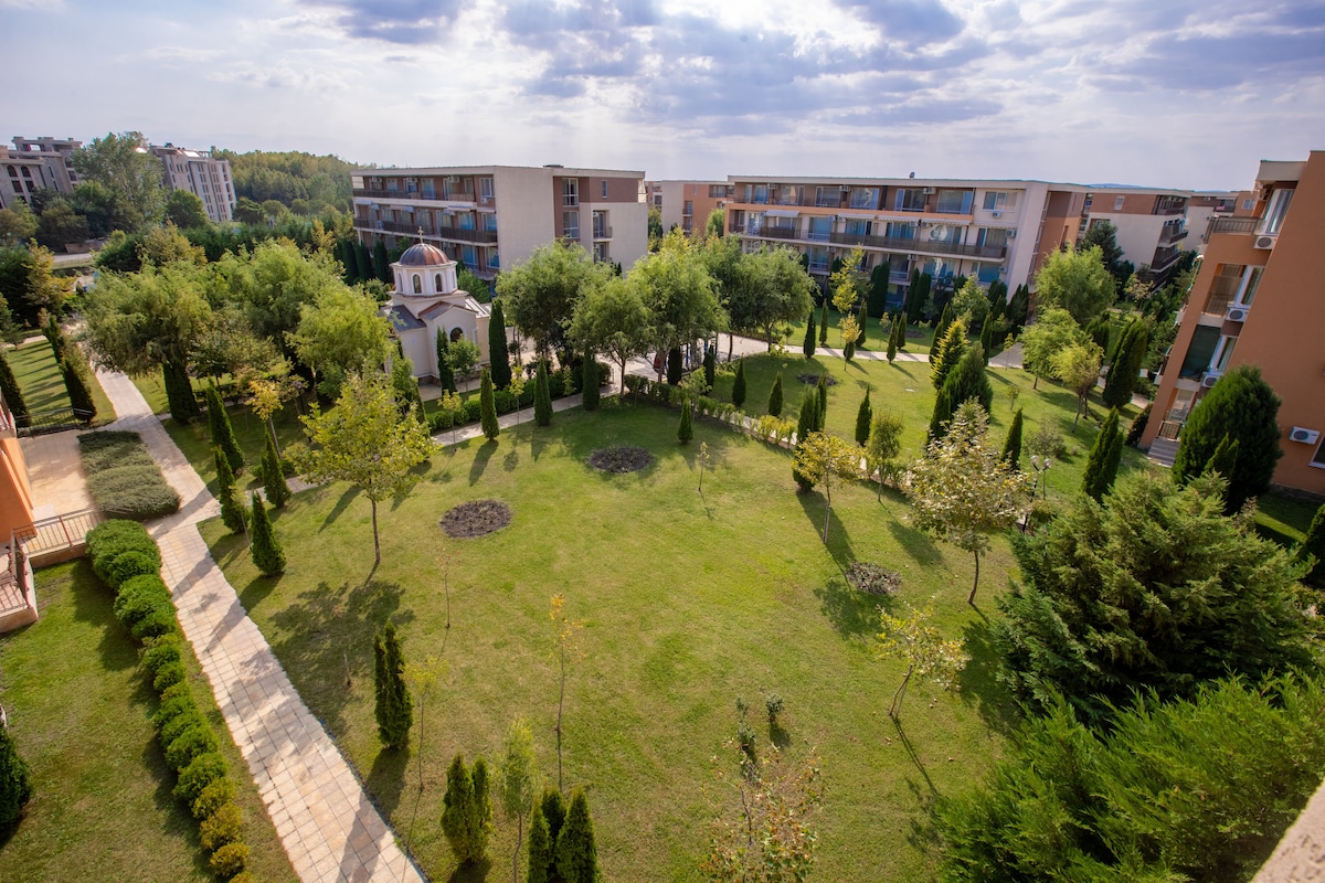 Our cozy Studio Serenity is perfect retreat for couples or families with up to two children. Located in a peaceful area of Santa Marina, just steps from the beach and near a large pool, it offers a serene escape. Enjoy a private terrace, beautifully landscaped surroundings, and easy access to Sozopol, only 2 km away. Santa Marina offers 5 pools, kids' pools, restaurants, a playground, wellness centers, tennis courts, and convenient transport within the complex and to nearby beaches.