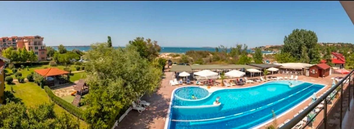 Welcome to our cozy 36,6 m2 studio located on the beachfront of the famous Tsarski beach in Sozopol. Perfect for couples or families with up to 2 children. Features a terrace with side sea view, kitchenette, hi-speed WiFi, and AC. Located in a complex with pool, sun loungers, restaurant, and direct beach access. Everything you need for a relaxing seaside stay. Private parking may be reserved on the spot (fees apply, ask at the reception). Breakfast and/or dinner - option (ask at the reception).