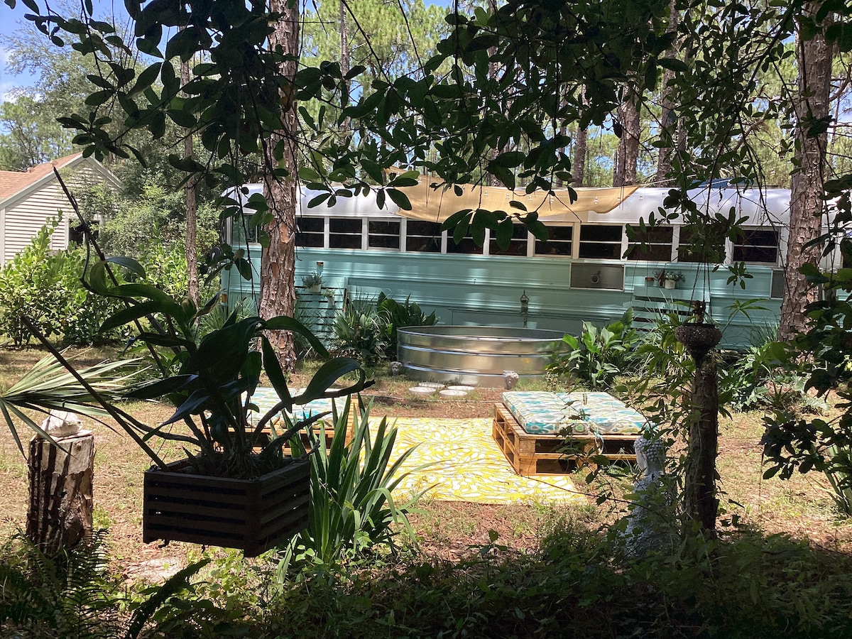 Enjoy glamping at Kai Hideaway! Located on a quiet dead end street, our recently renovated retro inspired skoolie is tucked away in the shade under beautiful and tropical trees. Our home is located next door, but because of the trees and its own driveway, you’ll have your own private tropical oasis all to yourself. Enjoy lounging in the hammock or comfy outdoor furniture, hanging out by the fire, or using the cedar outdoor shower. Unwind and relax in nature!