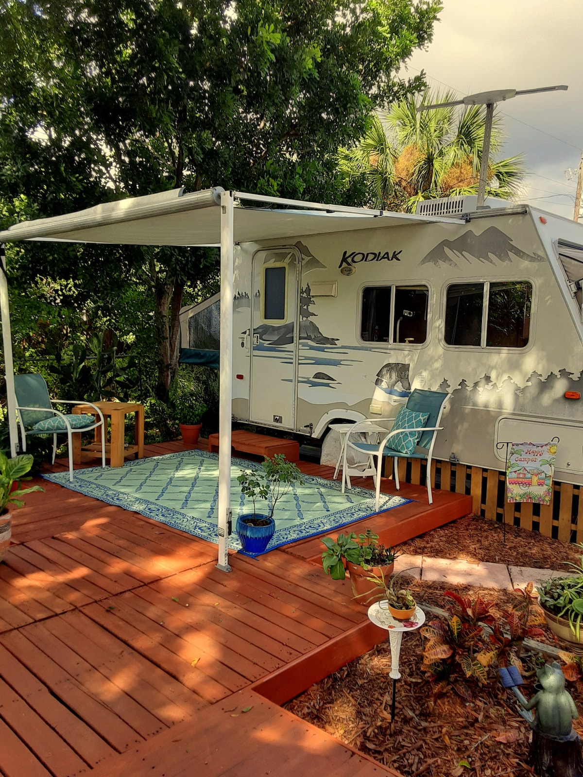 🎨 Very WALKABLE in the Eau Gallie Art District! Walk to 🍻 brews, bars, eateries, festivals, and Murals/Art! Private entrance, designated free parking, strong air conditioning, & a POOL for your next family stay/couple's getaway! This RV includes a memory foam Queen mattress, large fridge, propane oven/stove, microwave, fully stocked kitchen, smart TV, Fast WiFi 🛜 , large bathroom w/ shower, 3 recliners, and a coffee ☕️ /tea station! Furry friends 🐕 🐈 welcome as well! Visit the Chickens! 🐓