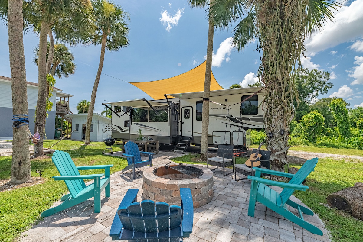 Your own private luxury camper complete with fire pit, hammock and lots of room to roam across from the Indian River. This luxury 5th wheel camper has an amazing floor-plan and layout with 2 full private bedrooms and an upper loft great for kids to have their own space and enjoy their very own floor. We have thought of just about everything to make your Florida stay an awesome adventure with luxury and comfortable accommodations. Stargaze, chill and glamp to the fullest. You deserve it!