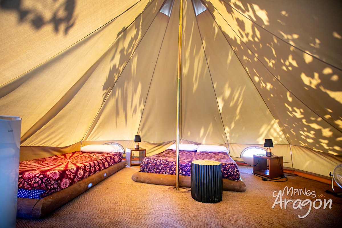 Bell tent voor 2 pers. op ruime plek met vrij uitzicht,vlakbij toiletgebouw. Incl 2 bedden met schuimmatrassen 190x90, poefjes,2 stoelen,tafel,electra, koelkastje en kleine lampjes. In de natuur, maar toch slechts 10 minuten lopen van het gezellige dorp Horta de sant joan.Aan de autovrije wandel-en fietsroute Via Verde en aan natuurpark Els Ports. Terrascamping dus vrij uitzicht . Alleen 14+. Gratis gebruik van warm water, boeken, spellen, zwembad,petanca,terras,BBQ ,buitenkeuken en Wifi.