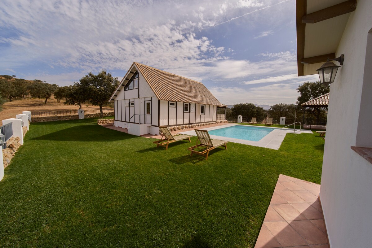 Disfruta con familiares y amigos en un paraíso terrenal. Vive una experiencia inolvidable en pleno campo con un clima soleado todo el año. Acogedora casa de madera, ubicada en finca privada de 750 hectáreas. Piscina privada, rodeada de encinas y olivos. Con capacidad para 6 personas. Visita nuestro establo. Explora senderos, podrás encontrar ciervos, una yeguada de 150 caballos de pura raza española y fauna como: ovejas, cabras, gallinas, potros, cerditos, jabalís, vacas y otros animales.