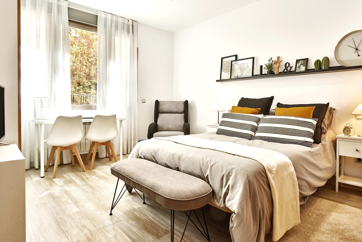 Elegant, bright two-bedroom, two-bathroom apartment in the central Eixample neighbourhood, very close to the Sagrada Familia, ideal for exploring the city on foot. Wi-Fi, TV with international channels and all modern comforts. The ceilings are high and the apartment is full of natural light. The furnishings are stylish and comfortable. The living room ceiling has the original Catalan Art Nouveau decorative mouldings. Reception is open from Monday to Sunday from 9 a.m. to 6 p.m.