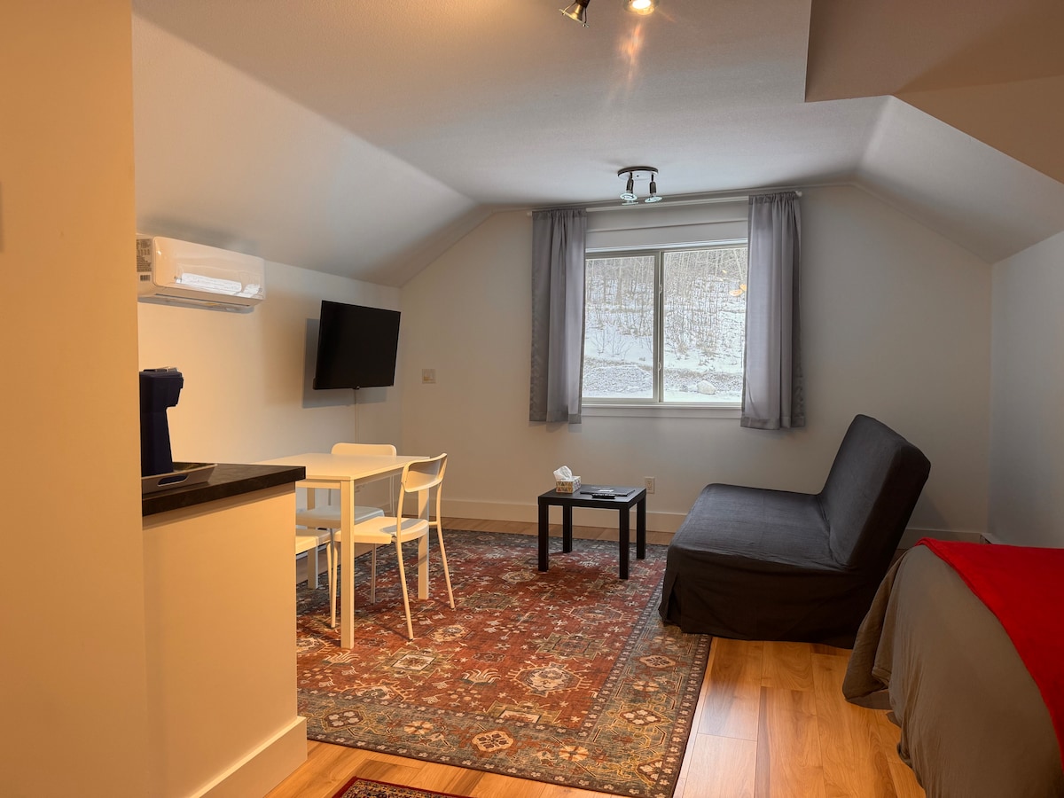 SMALL one-bed studio suite with a hide-a-bed (book for three if used). Private entrance & porch. Coffee, hot chocolate, and tea. Kitchen, Ruko & Netflix, WiFi, comfortable queen bed with luxurious high thread count sheets. , shower. This suite is BEST for a couple or small family due to lack of privacy. NOT for LIGHT sleepers, as you can hear us walking above you. If there are only two of you, but one of you sleeps on the hide a bed please BOOK FOR THREE PEOPLE. Children. Tesla charger: $10.