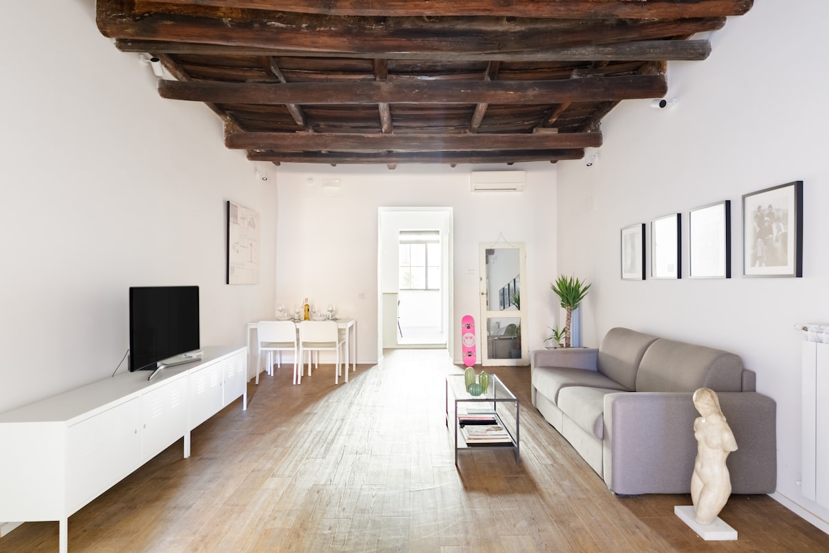 Spacious apartment with a modern and refined design in the heart of the ancient and characteristic Ghetto, the enchanting Roman Jewish district. You will be immersed in a welcoming and cozy atmosphere, with top quality furnishings and ultimate comfort. A unique and unrepeatable stay in the heart of Rome! In a strategic and exclusive position, you will be wrapped in an area of unique charm, close to the best cultural and historical sites, with typical restaurants, bars, clubs and shops.