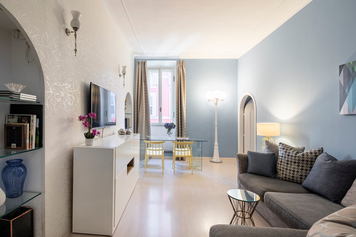 This stylish two bedroom apartment is housed in an XVIII-century building on a second floor and is located between the Spanish Steps and Trevi Fountain. It has recently been restructured by a renowned Italian architect. It has two master bedrooms, a spacious living room with a dining area, an elegant bathroom, a contemporary kitchen and an enclosed terrace, a rarity in the historical city. A Smart TV, Playstation and Netflix are available. Tea, coffee & some cooking essentials are complimentary.
