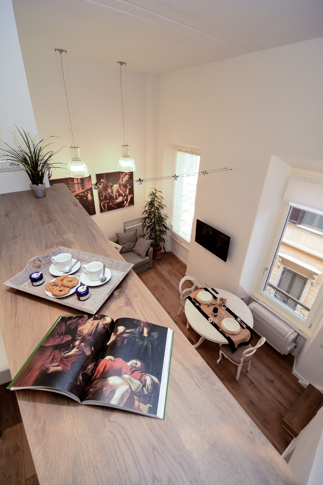 In the center of Rome a private penthouse open louvered window coverings in a living room to maximize light and reveal wraparound views of Central Rome and St peter's basilica. A period fireplace, terra cotta tiles create a traditional feel. Private terrace fully furnished. Two double bed rooms. Ten minutes walk from St Peter's square and Vatican Museums. Overlooking Rome and St Peter's. 2 minutes walk to public transportation, bus & metro will take you easily to all the main historical sites.