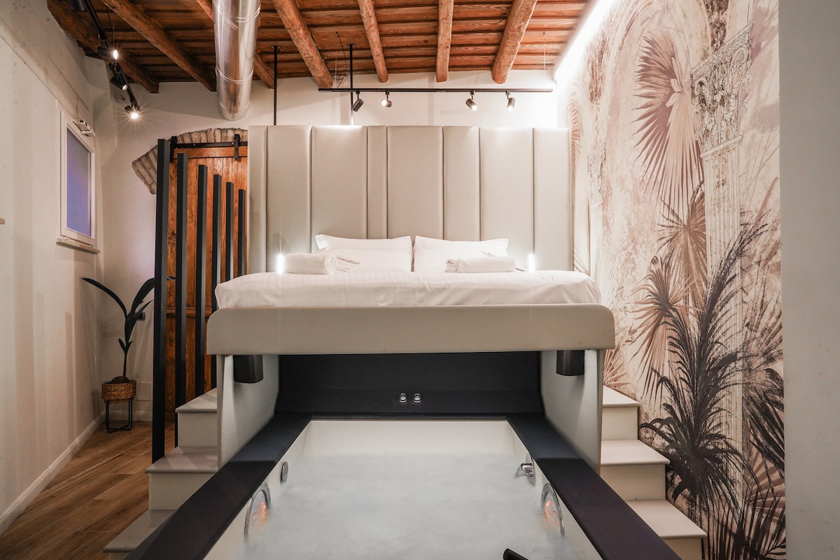 In the heart of Rome, on the seventh and top floor with an elevator of an elegant 19th century historic building, stands Nazionale Skyloft, an exclusive penthouse with a private Spa, offering an unparalleled stay experience. Its strategic location, adjacent to the Teatro dell’Opera, at Via Torino 122, near Repubblica subway (line A) and Termini Station, allows easy exploration of the historic center and vibrant districts while enjoying a refined retreat above the rooftops of the capital.