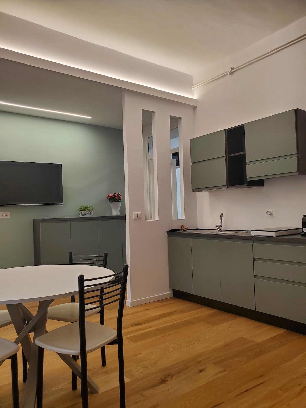 App Giulia is a large and prestigious 130 sqm flat located on the third floor of a historic building facing Via Condotti. It hosts up to 9 people in five rooms: 2 double bedrooms with own en-suite bathroom; a third double bedroom with an adjacent parlour with another bed. A third bathroom is available for everyone. The living room of over 33 sqm features a large chaise longue sofa (elegant double sofa bed), a large table and a functional open kitchen with all necessary amenities and appliances.