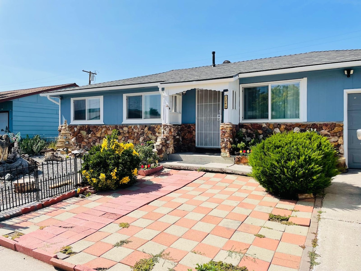 Our home has 3 bedrooms with queen beds, 2 bathrooms, one with a walk in shower, one with a bath tub. Located in Sparks. The house features a cozy floor plan. It has been renovated with new flooring, paint, and new furniture. The home has been decorated with comfort in mind. There are Tv's in each bedroom and living room and WIFI throughout. Carport parking for RV or trailer. Perfect for OHV toys or the BBQ cook offs. Fenced yards. Pet friendly. Laundry available. Propane BBQ onsite.