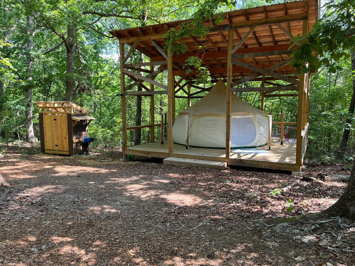 This rustic yet modern retreat environment offers guests the opportunity to relax, be still and soak up the magic of the property while being minutes from Landrum, Tryon, TIEC, FENCE, hiking, and local restaurants. The Belle tent is furnished with a comfy queen bed, a fan for your comfort, coffee and tea for an enjoyable morning, indoor lighting, a private bathhouse with a toilet and shower with instant hot water. Enjoy the community fire pit, you just never know who you will meet!