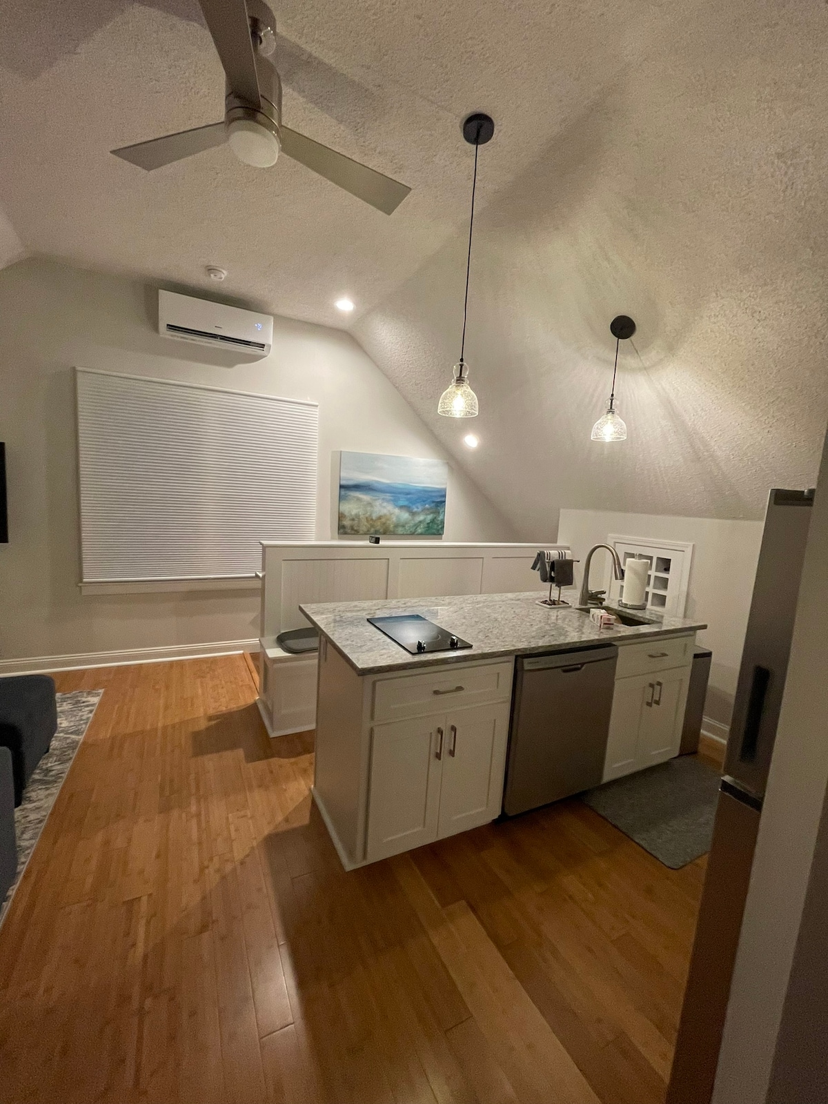 This fully renovated, king-bed guesthouse offers a peaceful, airy stay perfect for parents of college students, couples on a getaway, business travelers, and more. You'll enjoy a full kitchen, stocked coffee bar, spacious bathroom, and stylish living room with RokuTV. Parking is onsite with a private driveway and entrance. This puts you 10-15 minutes from downtown Spartanburg, including Converse, Wofford, and Spartanburg Methodist Colleges, and 20 minutes from USC Upstate.
