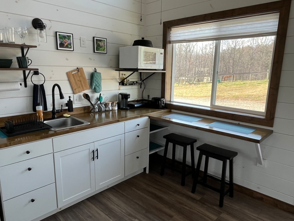 Perfect for a romantic or solo getaway, a sight-seeing trip, or just passing through! This 360 square foot tiny home feels spacious and is convenient with the one story floor plan, high ceilings, natural light, and basic amenities for your stay. There is NOT a TV but there is high speed WiFi is for use on your own device! Just a few minute drive from Tryon and Landrum for dining/ shopping, and plenty to do in the area or just relax and enjoy the beautiful farm!