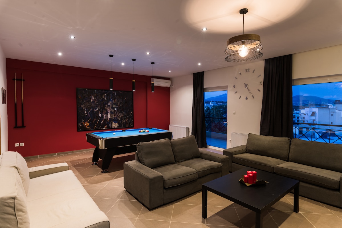 A truly unique royal-style penthouse just 8 min from Athens Airport. Like a private museum, it features antiques, oversized 200×220 beds, a large private terrace, and access to the rooftop for panoramic views and plane spotting. Ideal for families, with plenty of space and character you won’t find anywhere else in the area. Glass doors flood the space with natural light and frame the open sky — a one-of-a-kind stay that blends classic charm with rare city views.