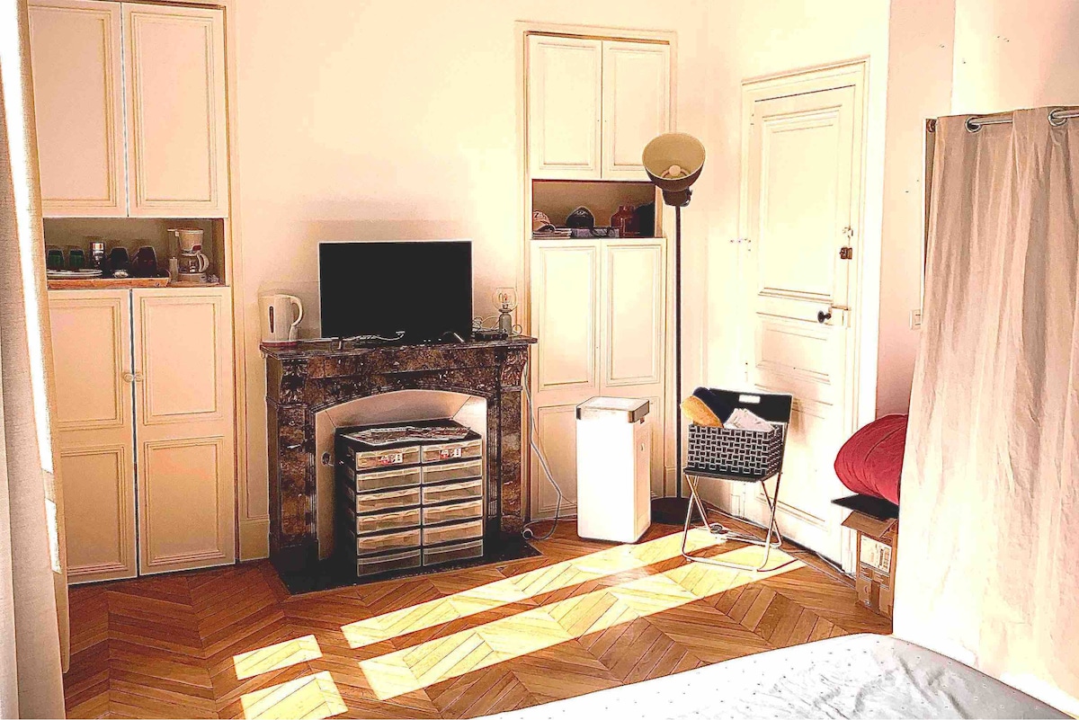 Profitez d'un logement de 20m²mansardé sous toit, décoré sur le thème de L'Asie. Composé d'une pièce de vie , un espace cuisine équipée et aménagée avec machine à laver, un lit 180 , une salle avec . Situé au deuxième étage d'un immeuble style haussmannien (pas d'ascenseur. Quartier vivant de nombreux commerces de proximité . ⚠️⚠️travaux devant l'immeuble / restaurant en bas de l'immeuble / lycée et église de l'autre coté de la rue . Risque de bruit et odeur restaurant
