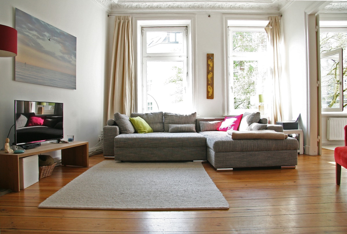 Neueröffnung 9/2020. Wunderschönes Apartment in ruhiger Innenhoflage am Rande des Schanzenviertels. Übernachten Sie in der 1885 gebauten und 2020 sanierten Kaufmannsvilla in einer verkehrsberuhigten Wohnstraße. Altbaucharme mit moderner hotelähnlicher Austattung, verbessertem Schallschutz und gut ausgestatteter Küche. Fußläufig erreichbar befinden sich zahlreiche Bars und Restaurants des beliebten Szeneviertels Sternschanze. Kinderfreundlicher Stadtteil mit vielen Spielplätzen.