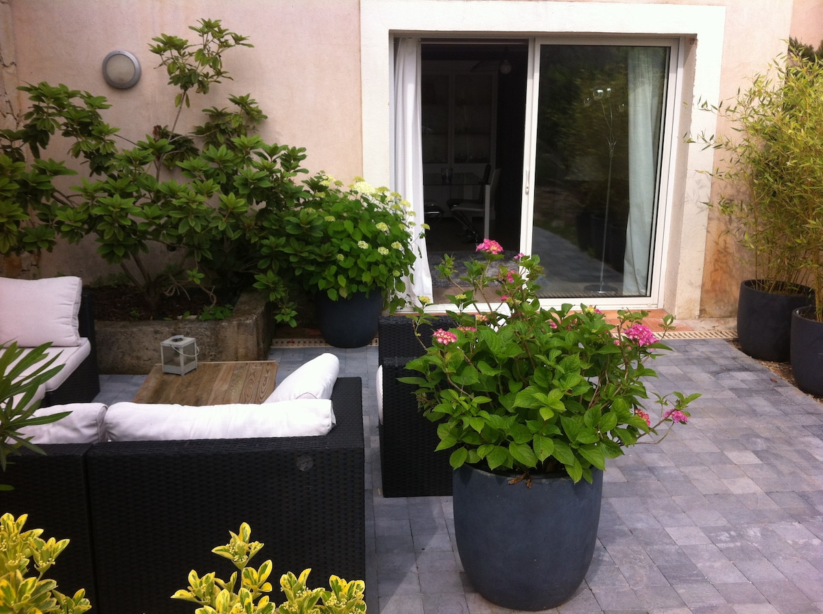 Bonjour dans quartier résidentiel bas de villa 45 m2 indépendant. Village a pied, commerce, proche grasse 10 min cannes 20 min mandelieu 20 min...tourisme, ville et pleine nature, plage, lac, rivière, piscine...activités adultes enfants, jeux, ballade, restos, glacier... une chambre individuelle dressing, cuisine moderne, salon, salle a manger, toilette indépendant, douche a l'italienne design, deux clic clac, clim, TV connectée netflix etc... parking avec terrain privatif. Aides et conseils...
