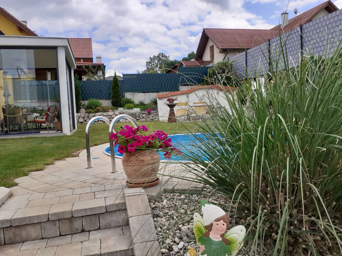 The newly built house is located in a quiet location 20km outside of Linz. The best and easiest way to reach it is via the motorway A7 exit Engerwitzdorf or by train from the station Lungitz. You have the whole first floor to yourself: The bedroom is lockable. You have your own bathroom with a bathtub and your own living room with a desk and TV. You can also use the pool. Final cleaning for free.