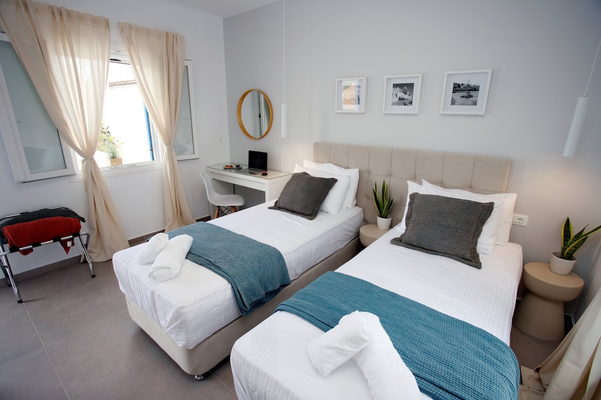 Welcome to your Spetses home! Just a short walk to beaches, coffee shops, restaurants, and museums. This renovated 2-bedroom ground floor apartment with European Queen beds, sleeps 5. Amenities include washer, dishwasher, and 50" smart TV (Netflix with your logins). Perfect for families or friends wanting to explore the island. Only a short 9 minute walk from the main port. Live your Spetses island vacation here!