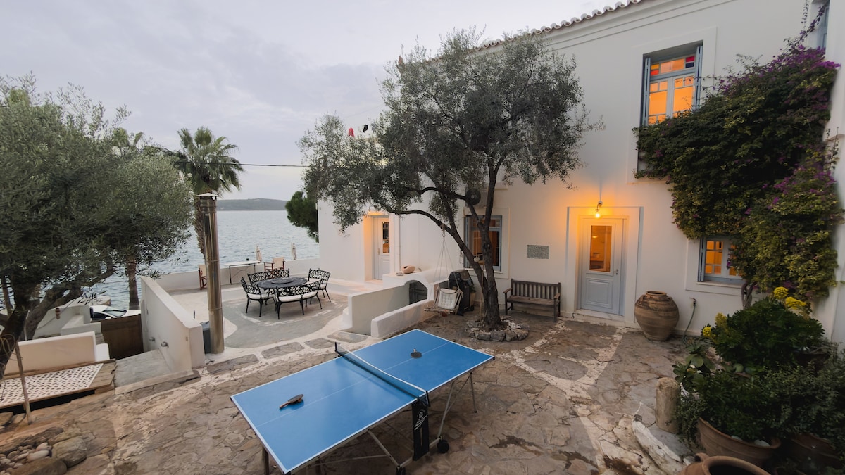 If you have seen “Glass Onion: All knives out”, it’s the villa in the intro of the movie (from 13:00-18:00). Unique location by the sea close to everything: the iconic Poseidonion Hotel, the island centre, two open-air cinemas, the market, restaurants, cafes, bars, beaches,everything in walking distance and with the best views of the sea and beautiful sunsets. 4 bedrooms, that sleep 8-10 people, all with their own bathroom, various outdoors terraces, nice spacious bright kitchen.